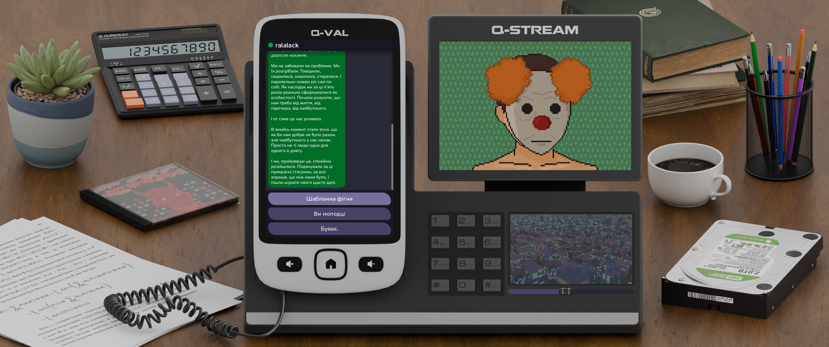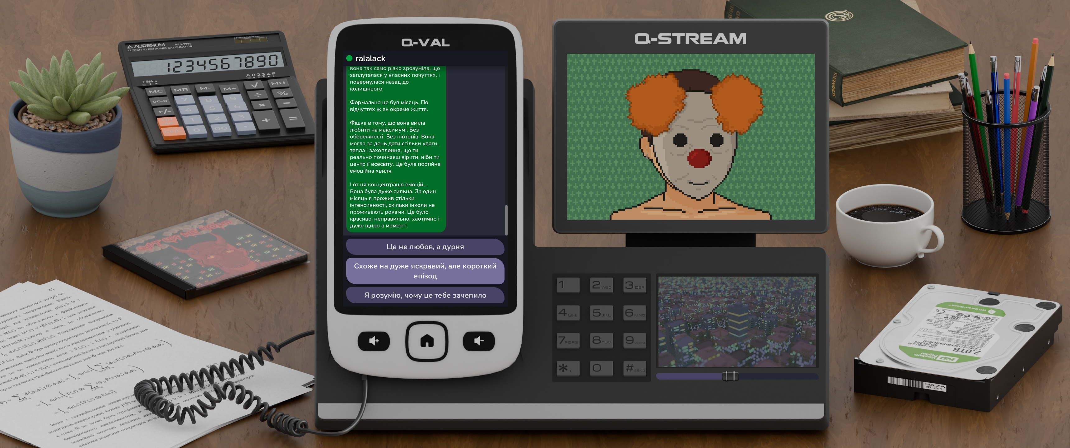 Дуже незручно, що текст зʼявляється досить повільно і це неможливо прискорити. Розумію, що це було зроблено, щоб передати почуття стріму, де ти теж не можеш просто прискорити, перемотати і ін., і це змусило мене залишати гру на фоні і слухати хв 15, як стрімер-клоун виливає на мене свої хуйопереживання. Імерсію якусь це додало, звісно, але не скажу, що це був смішний чи значимий досвід. Навіщо там ці клікабельні цифри? Вибори, наче, нічого не змінюють (а перевірити це важко, тому що гру не хочеться перегравати). Складно сказати щось по тексту, бо на фоні його вловлюєш процентів 20, але титри дійсно віддають разючою ШІшністю, що ще погіршує весь попередній досвід.
